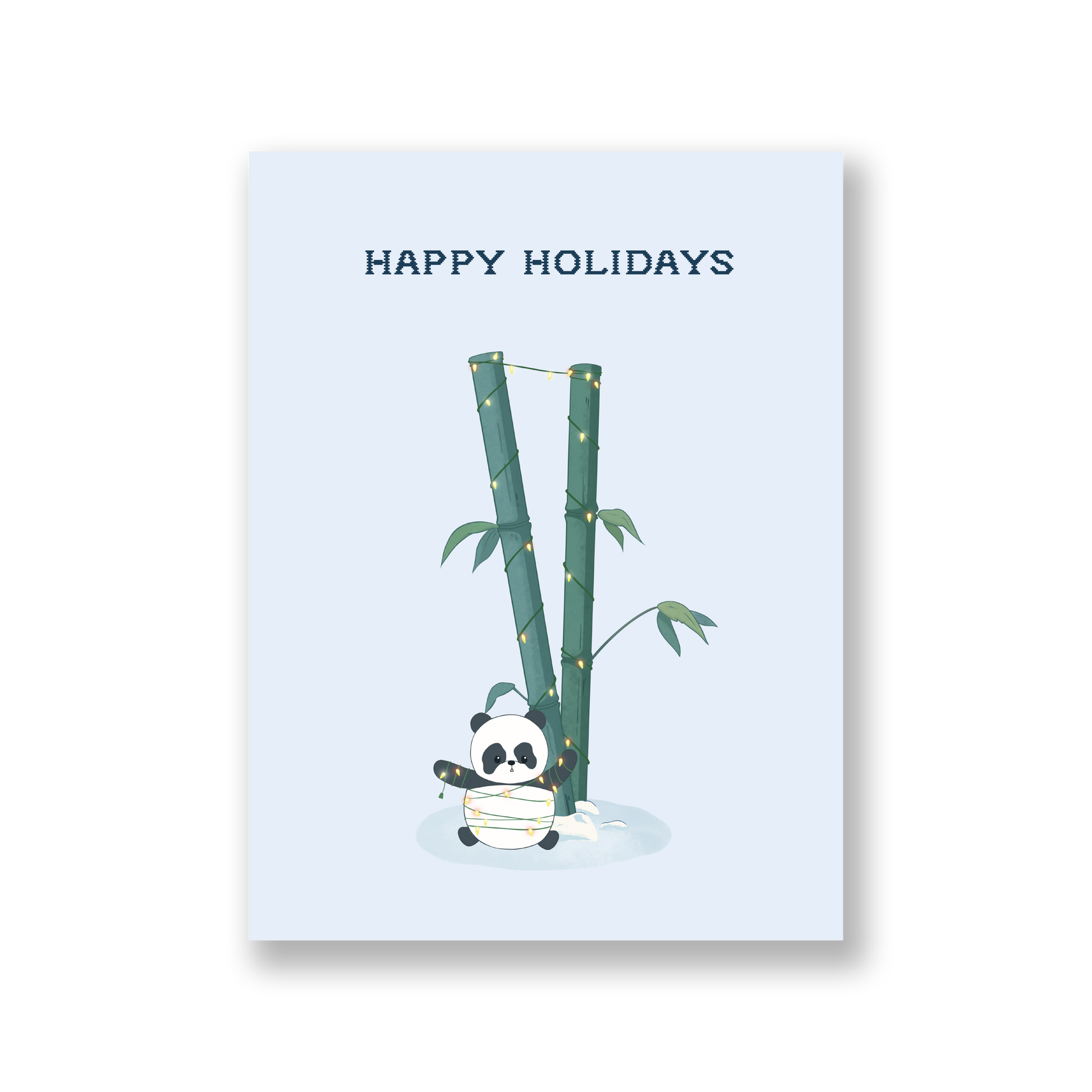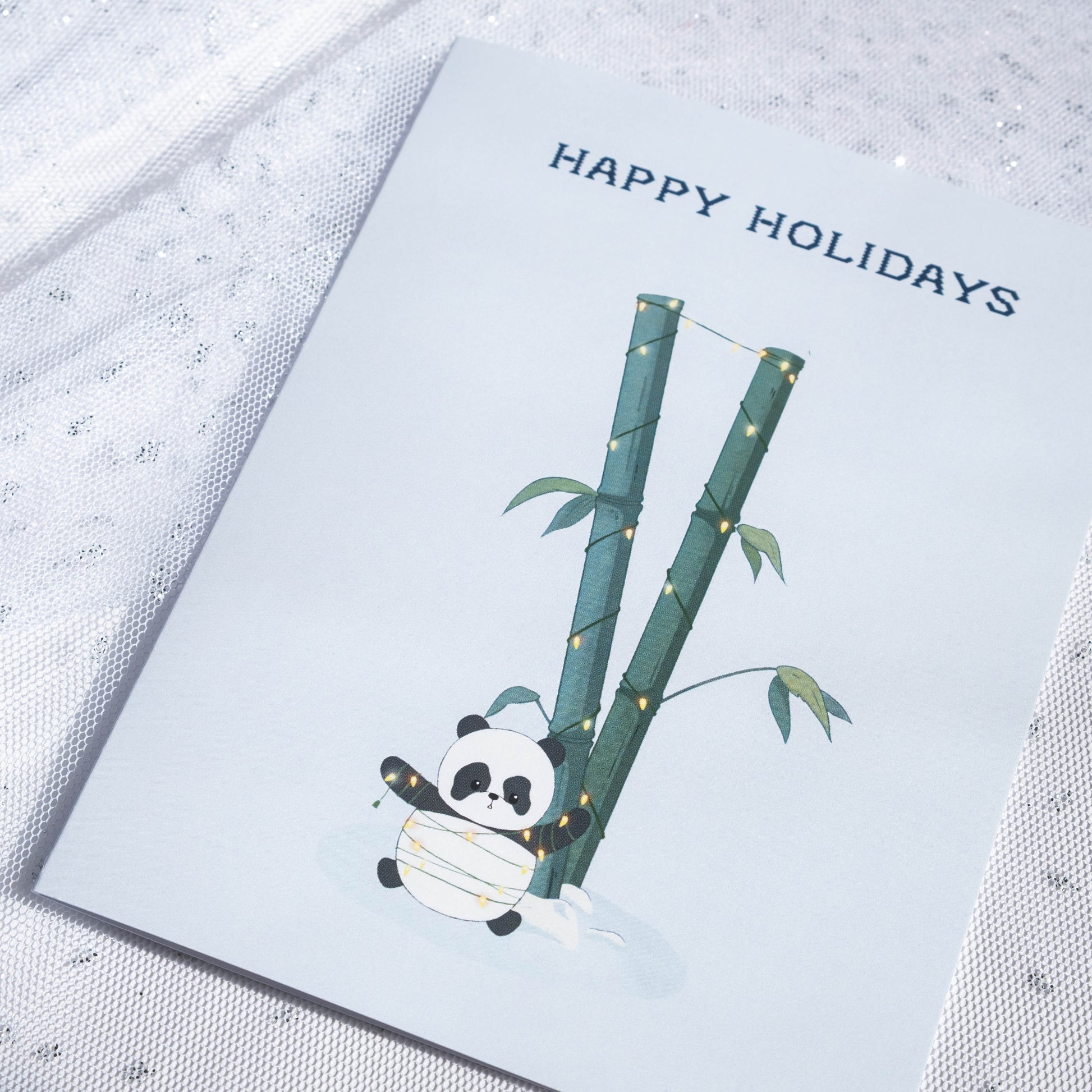 Spread holiday cheer with our panda adorably entangled in holiday lights.
